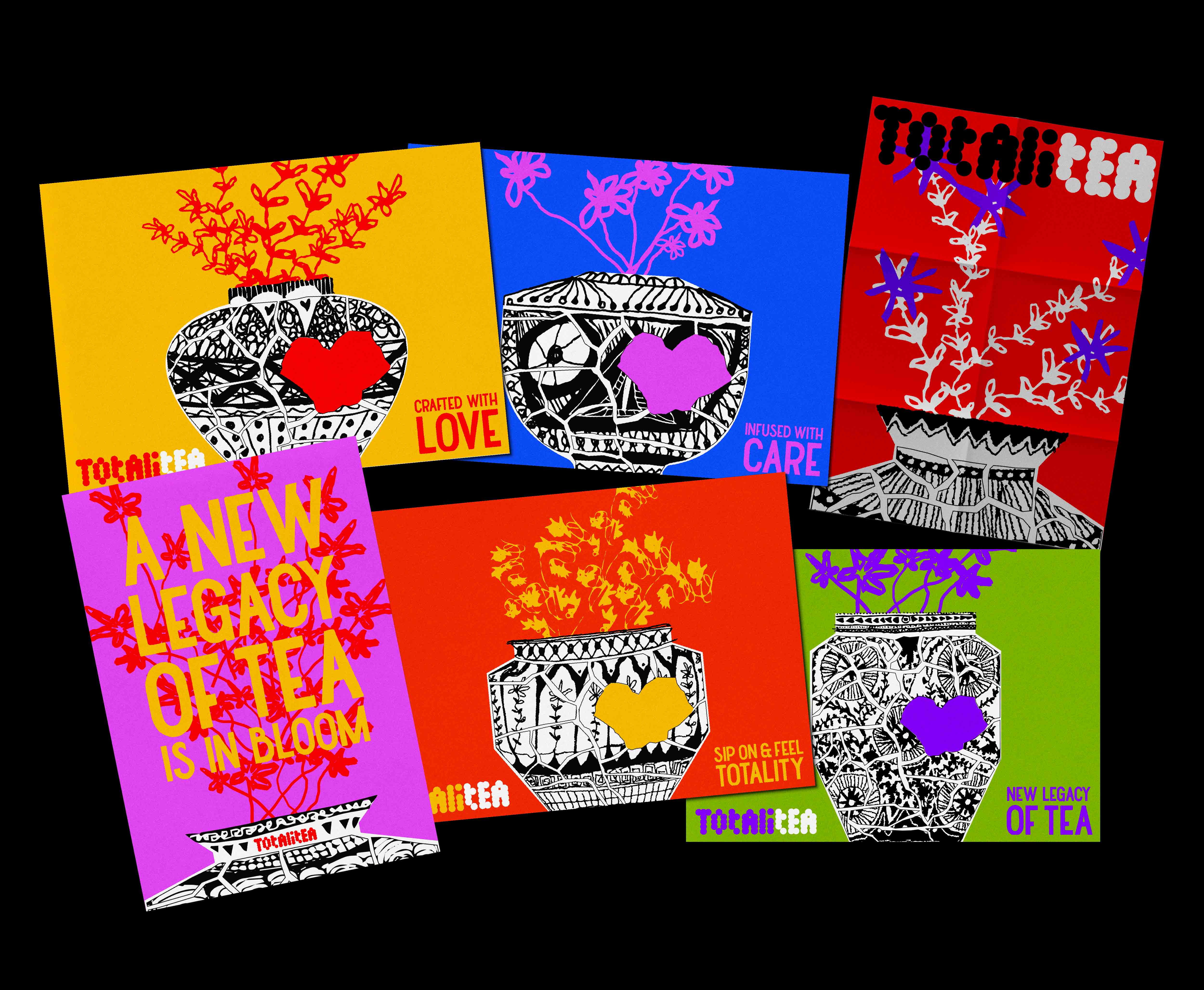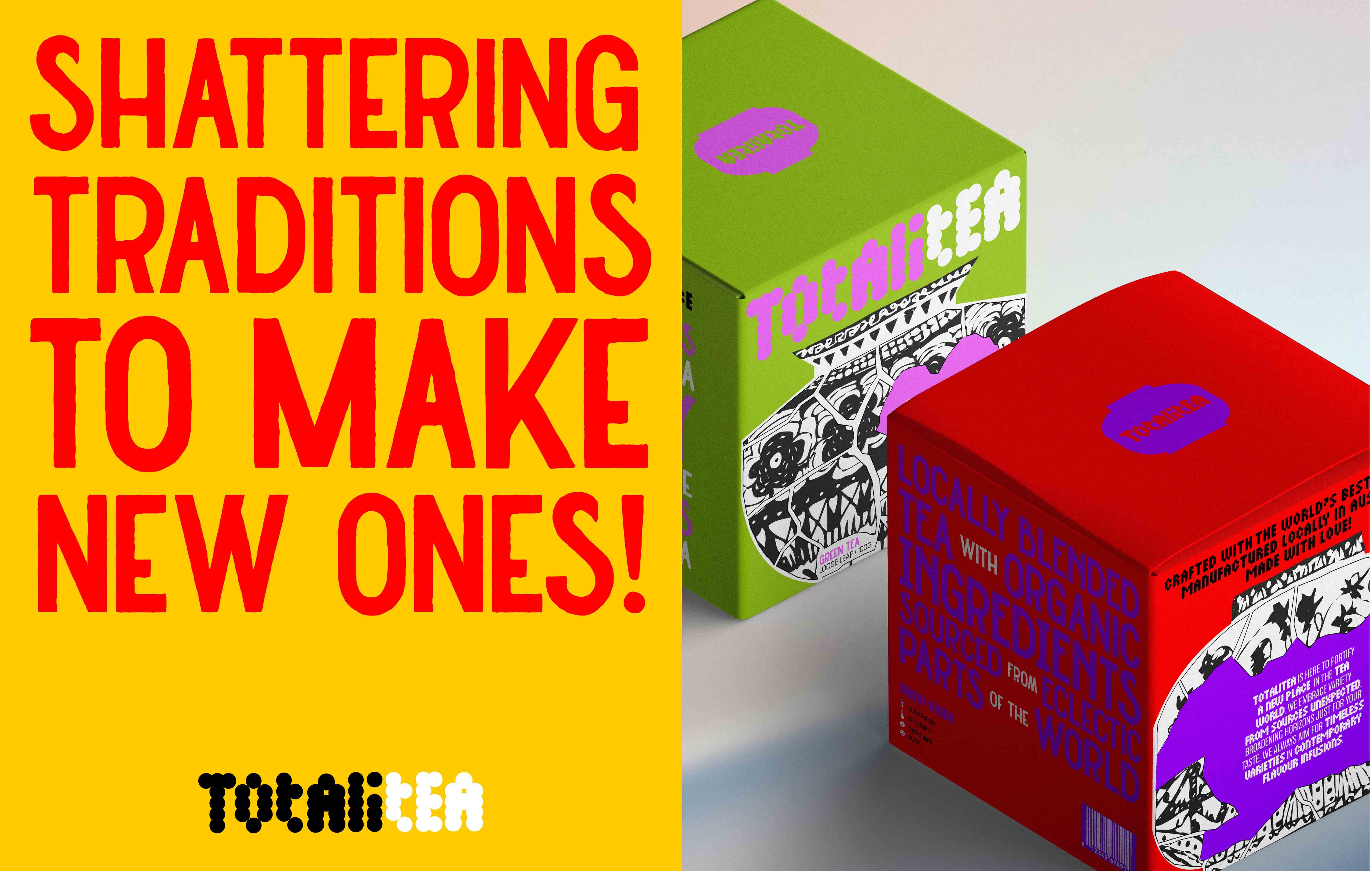 This project illustrates the brand identity and packaging design for TOTALITEA, the name of a fictitious new tea brand concocted by myself. The brand harnesses its visual identity by the intention of marketing the line to a younger demographic - with the hope that the customers will be encouraged to inherit these important cultural relics whilst simultaneously staking out for newer histories, traditions and rituals that are completely of their own as they embrace the product.